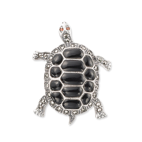 Sterling Silver Marcasite Turtle Brooch with Multistone Onyx