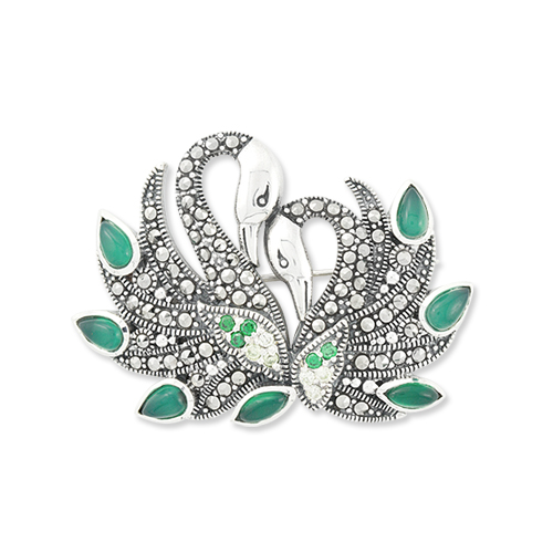 Sterling Silver Marcasite Two Swan Enamel Brooch with Cabochon Stone